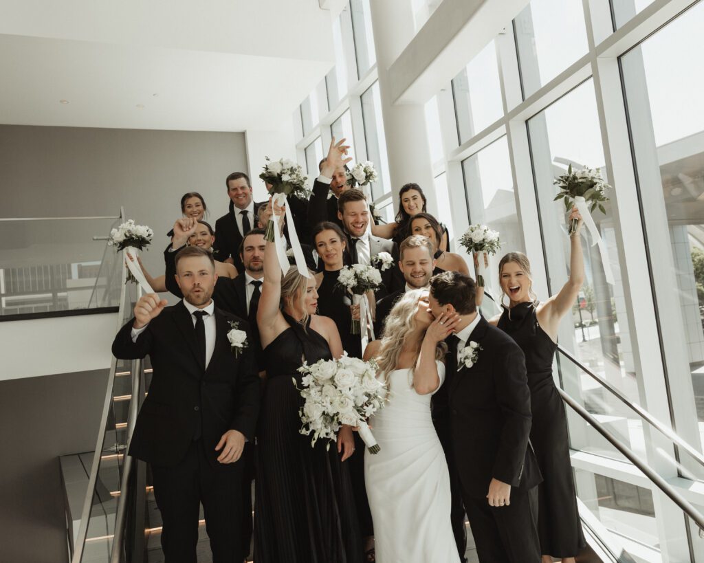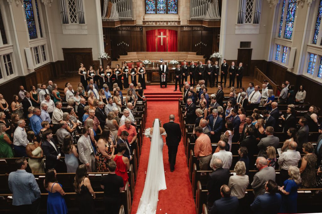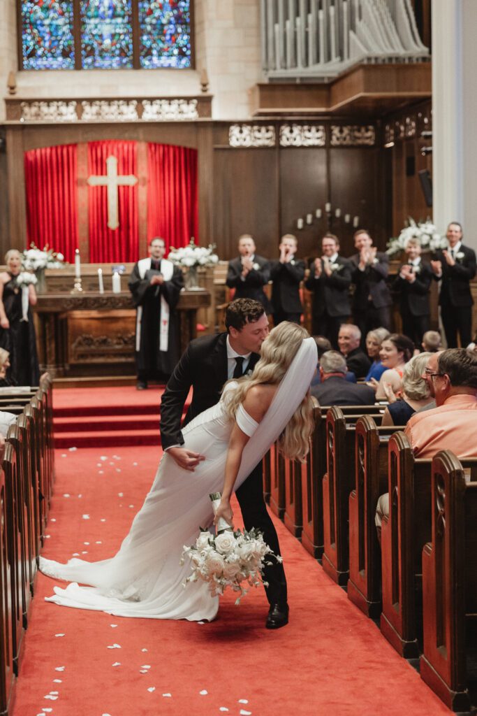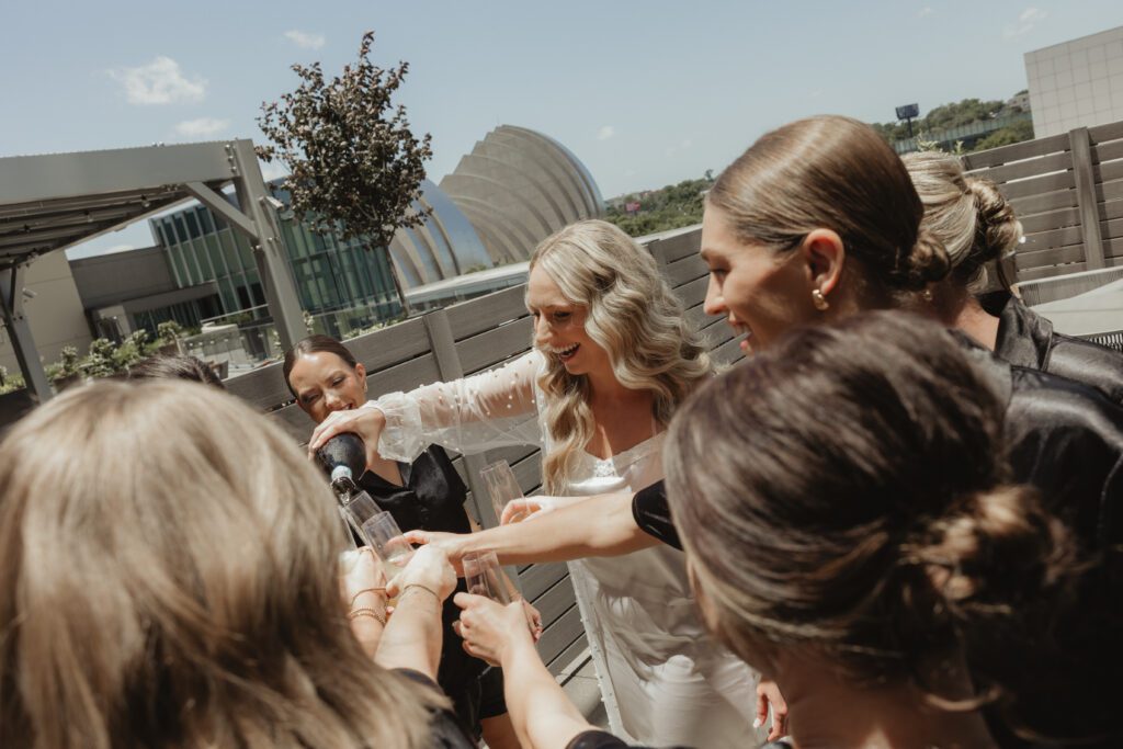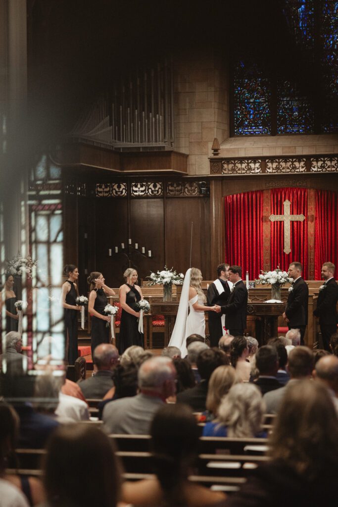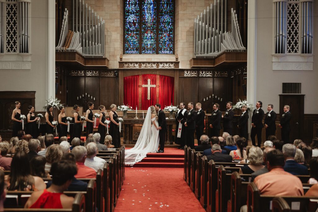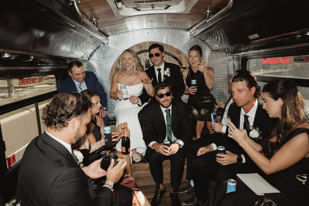 The morning began at the Loews Hotel Kansas City, where we documented the ladies getting ready with all Alex’s favorite people, soaking in all the excitement before Nathan and Alex shared their first look. From there, we headed to Country Club Christian Church for a beautiful ceremony surrounded by their friends and family. Their exit was full of cheers, hugs, and happy tears before everyone hopped on a party bus to keep the celebration going.
